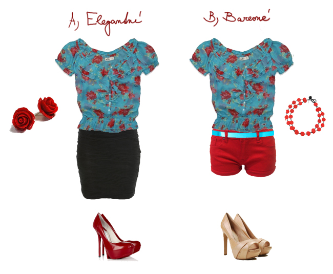 Co vypadá zaručeně dobře na fotkách? Barvy! A tomu je přizpůsobený model napravo. S tunikou jsem kombinovala červené šortky (kvůli červenému vzoru) a jednoduchý náramek, který model ozvláštní, ale nebude se přebíjet se zbytkem oblečení. Zvažovala jsem, jestli přidat boty v tyrkysovém odstínu nebo nude. Nakonec vyhrála nude barva, protože A) kolik žen má doma tyrkysové lodičky a za B) už to na mě bylo barevné až moc :)