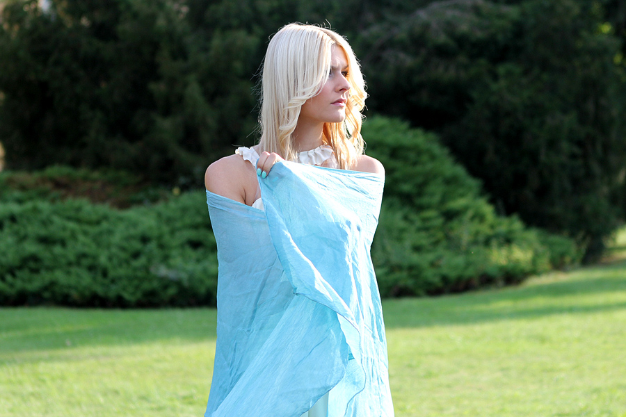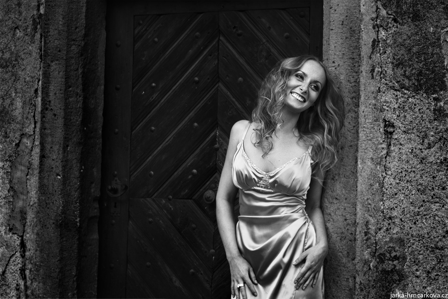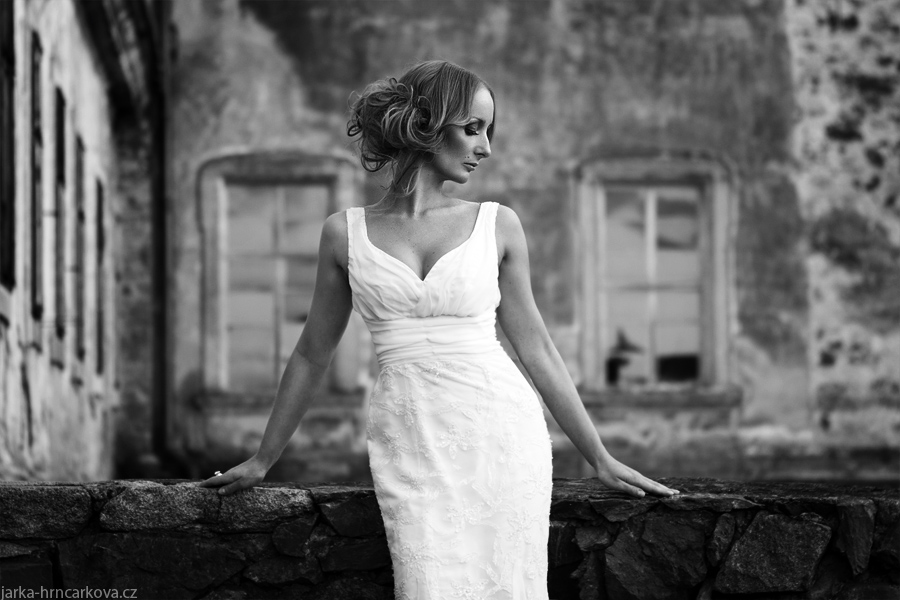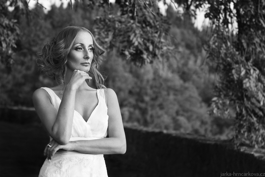 Fotka nahoře je moje nejoblíbenější z celého focení. Líbí se mi na ní snad úplně všechno: překrásné šaty, ještě lepší účes (mám ho zamluvený, aby mi ho Míša učesala, až se budu vdávat!), prostředí a hlavně dokonalý výraz Jany! Mám ráda, jak skloněná hlava působí emocionálně a zavřené oči mi evokují, jakoby se Jana toulala ve svém vlastním světě, ponořená do myšlenek, užívající si té krásné chvíle, kdy jí poslední sluneční paprky lehce šimrají do obličeje.