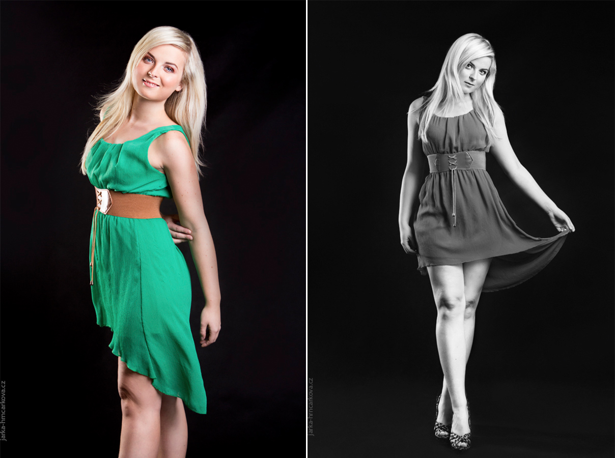 Já mezitím vybrala několik modelů z oblečení, které si Mirka přinesla. Učarovaly mě zelené vílí šaty, které mají vzadu trochu delší sukni (můžete je vidět na fotkách nahoře). Myslím si, že dobře zvolená zelená barva blondýnkám moc sluší a zrovna tyhle šaty působily úžasně žensky a křehce.