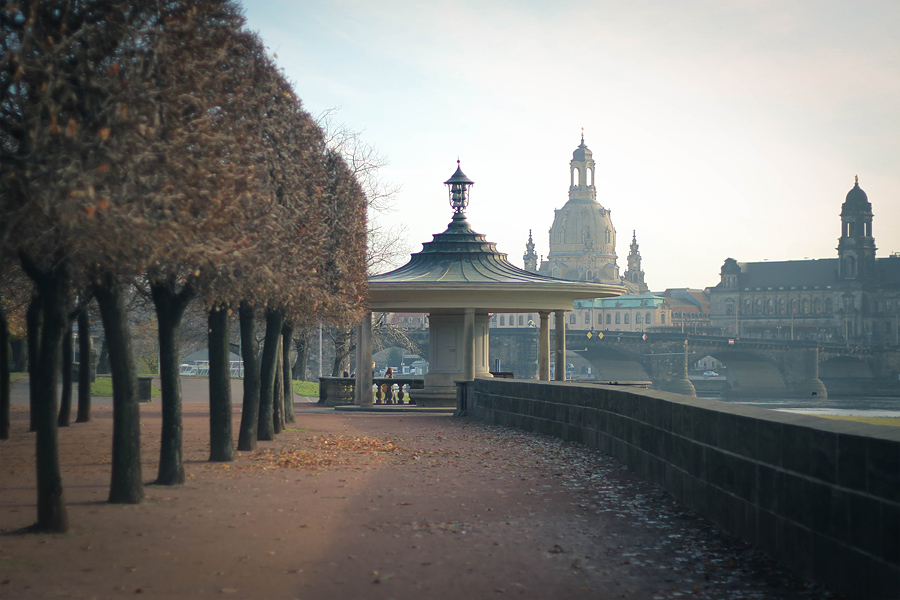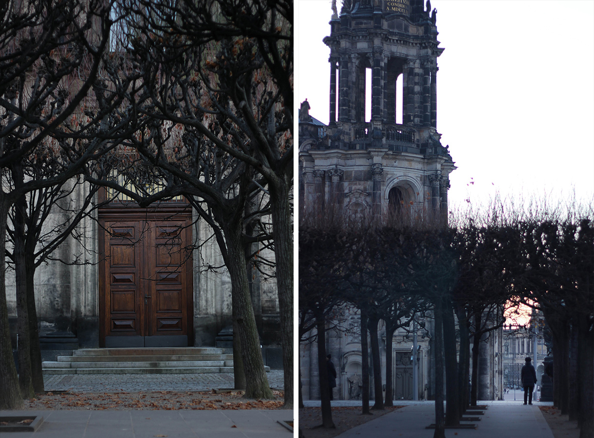 Vyšlo nám krásné počasí, takže jsme si Drážďany mohly i docela projít. Město mělo vzhledem ke své ne příliš optimistické historii, pozdnímu podzimnímu počasí a soumraku, který se rozlil vždy téměř okamžitě po třetí hodině, velice silnou atmosféru. Na každém místě jsem se zapřísahala, že tam někdy budu muset fotit a tak se město posunulo na druhé místo mého imaginárního žebříčku top míst na focení fashion editorálů. Schválně, jestli uhodnete, co je na prvním místě :)