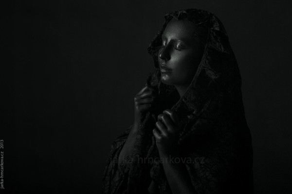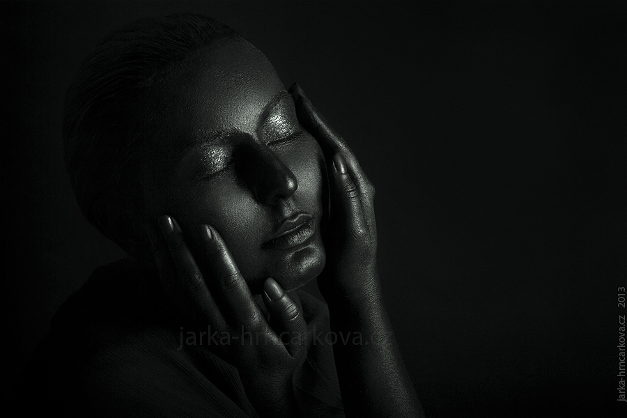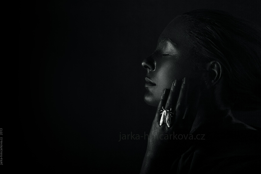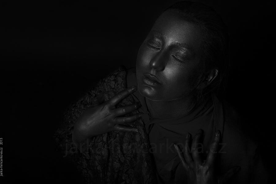 Někdy před Vánoci jsem viděla fotku s modelkou, která měla lesklou, černou, jakoby olejovou pleť. A od té doby mi to nedalo spát, protože jsem chtěla vyzkoušet něco podobného.Vymýšlela jsem nejrůznější způsoby, jak pokožku obarvit (potravinářské barvivo, krém smíchaný se sojovou omáčkou … jeden nápad lepší než druhý), dokud mi Kristýna (modelka na fotkách) neprozradila, že existuje taky něco jako barva na tělo!