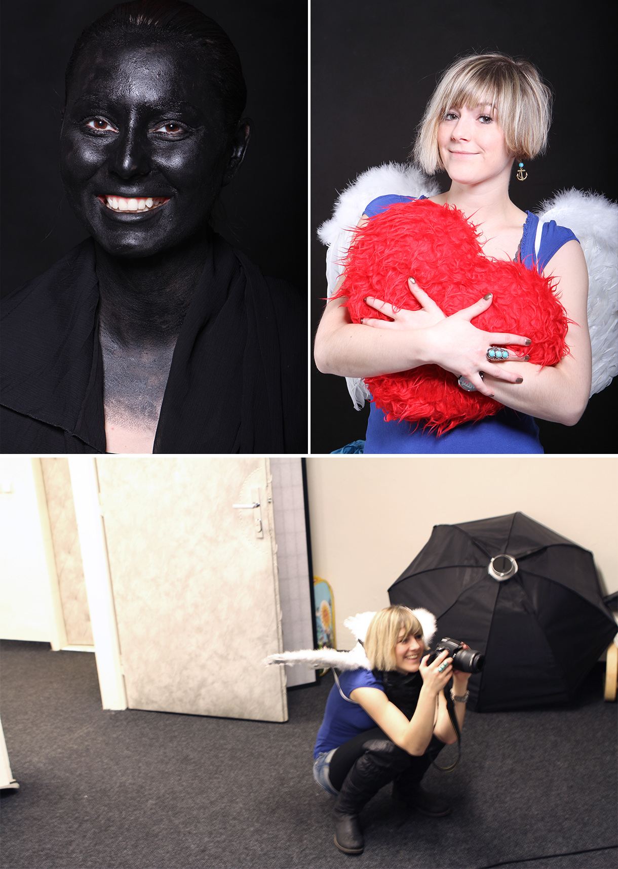 Na druhé fotce asistenka Evča zkouší ateliérové rekvizity. A na třetí pořizuje přímo andělské fotky.