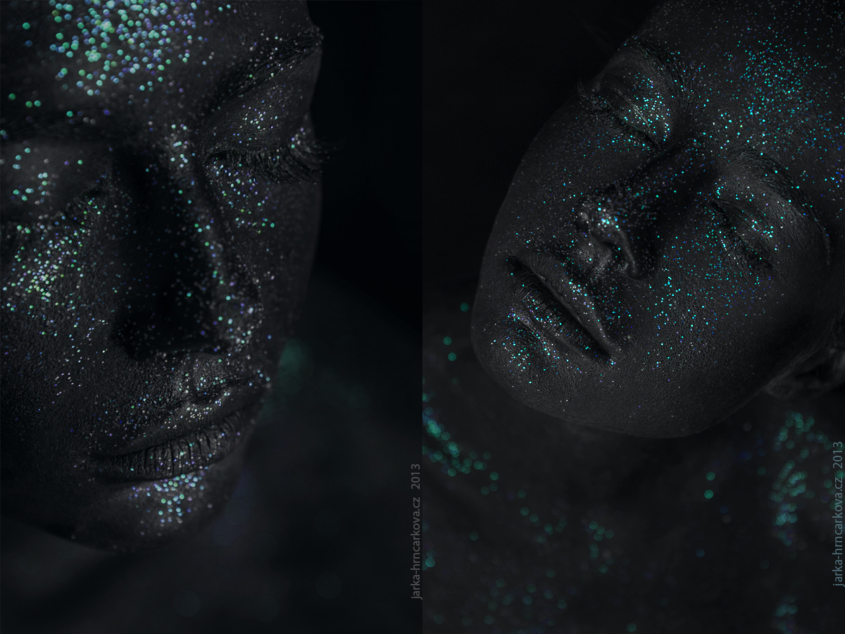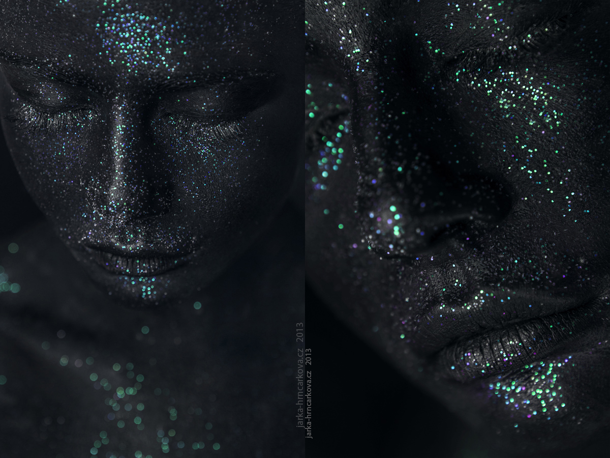 V tu chvíli mi bylo naprosto jasné, že v sérii nabarvených fotek budu pokračovat. Nejdřív, než jsem začala trápit nějakou modelku, jsem vše otestovala na sobě. Zkoušela jsem, při jakém světle třpytky nejvíc vyniknou. Ukázalo se, že zachytit třpytky dostatečně výrazně je docela oříšek. Foťák nezachycoval správně jejich třpyt ani barvy.