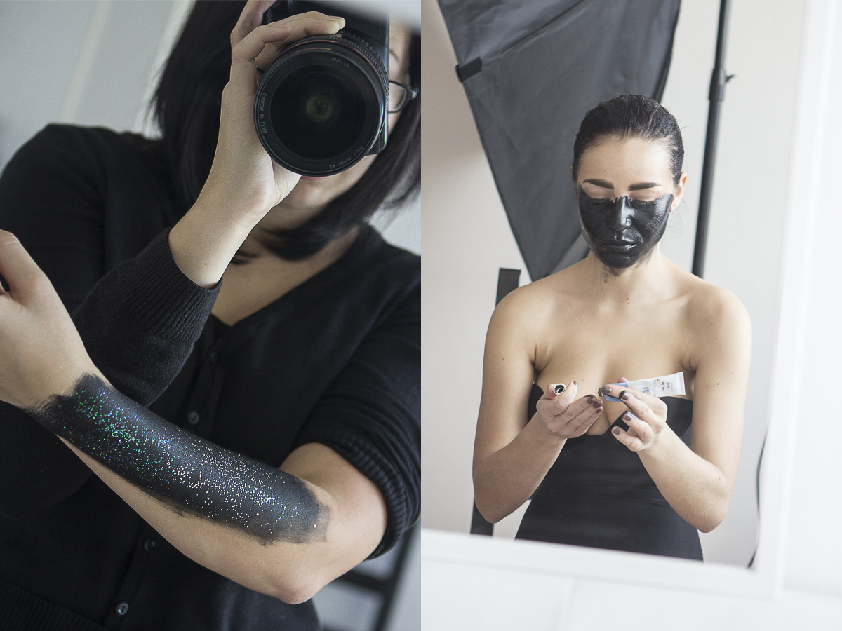 Jedno nedělní odpoledne, pár týdnu později, jsem se trochu nudila. Přemýšlela jsem co dělat, a tak jsem ze skříně vytáhla krabici, ve které mám různé rekvizity na focení. Kromě paruk, vintage rukavic či černého peří se tam vedle sebe povaloval zbytek černé barvy na kůži a zapomenuté třpytky.
