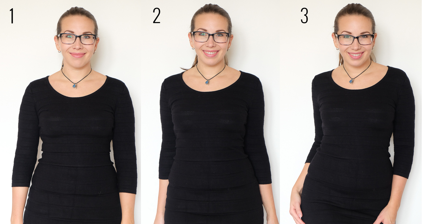 Pokud chcete zeštíhlit nějakou část svého těla, je obecným pravidlem, že ho směrem k foťáku natáčíte tou nejužší částí. Všimli jste si, že ruce jsou ze strany širší a zepředu štíhlejší? Toho, abyste ukazovali přední, štíhlejší část, dosáhnete tak, že se jednoduše narovnáte a stáhnete lopatky k sobě (obr. 2).