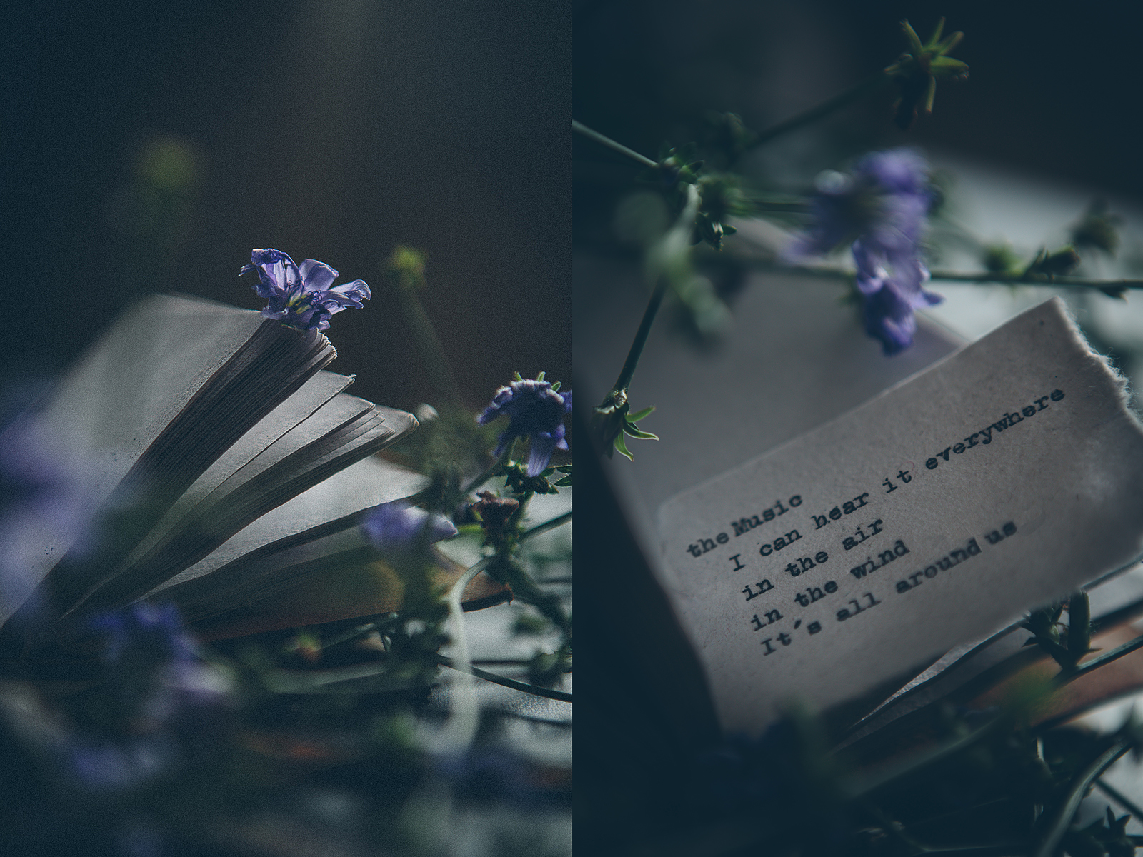 Focení mi dává možnost utrhnout několik květin u tramvajové zastávky, rozložit je po stolku v obýváku a na pár minut se ponořit do představ o opuštěném zámku, v jehož jedné místnosti jsem, krčíčí se pod přikrývkou z pavučin, našla pomačkaný zápisník plný básní.